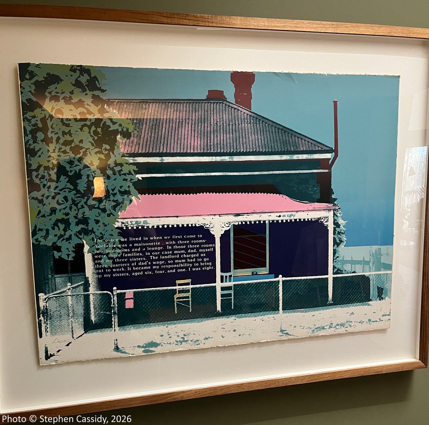 One, by noted artist Andrew Hill, was from a project in 1984 called ‘All our working lives’, from my time as Arts Officer for the Trades and Labor Council of SA during its Centenary. It had been lying under our spare bed in the guest room, but we finally decided to get it framed after all those decades and cities.