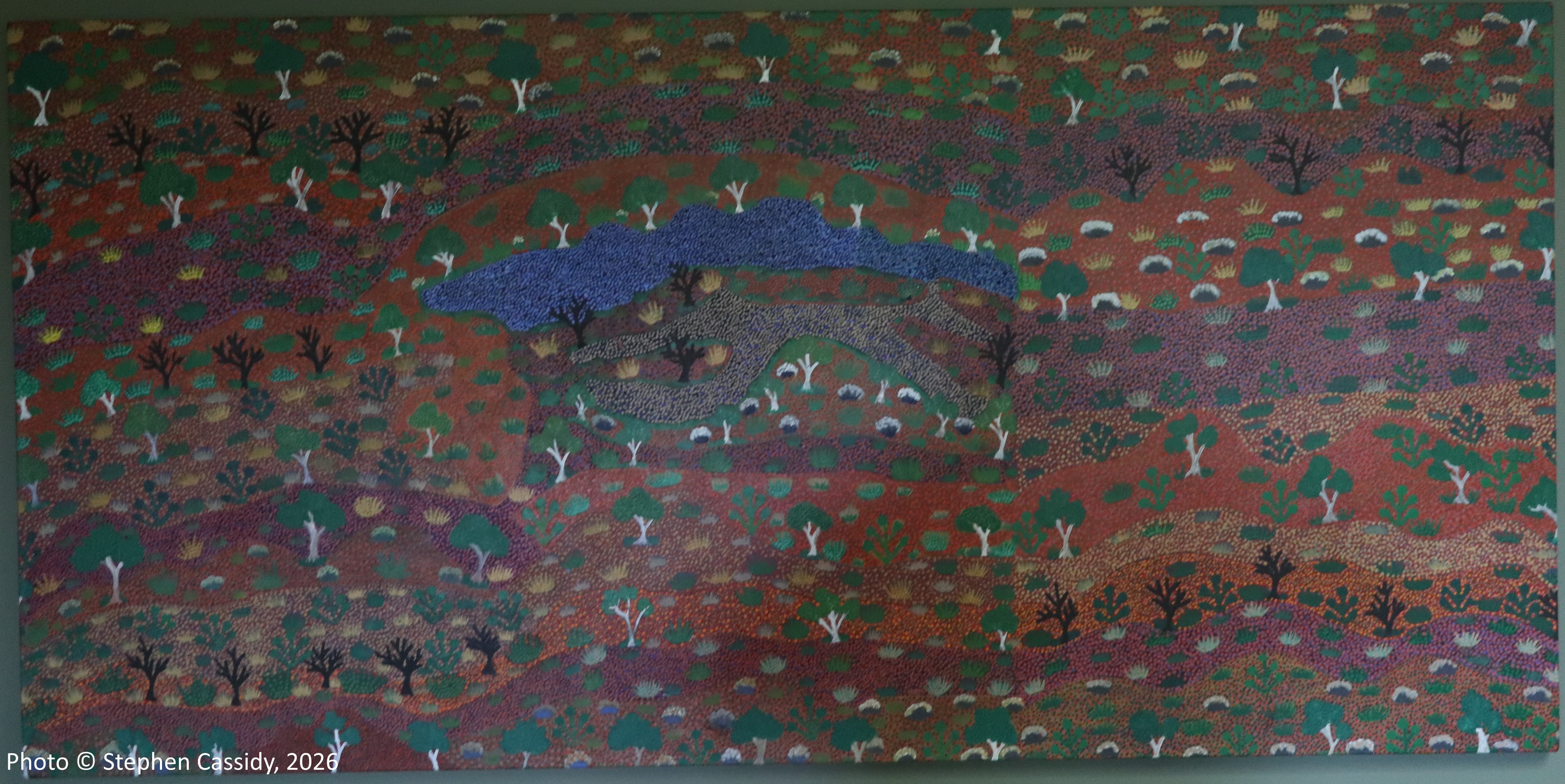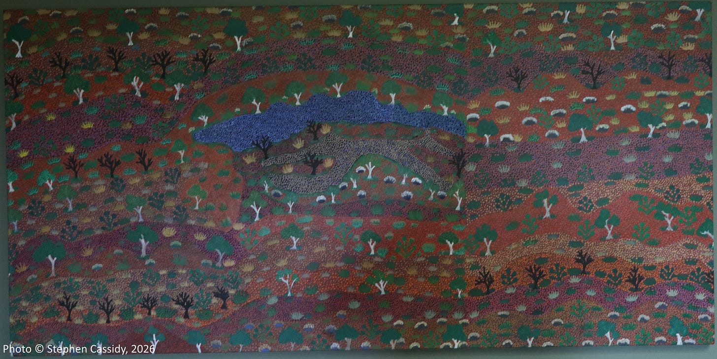 At the framers I noticed a striking work that had just been finished leaning against the wall and turned it over to find out more about it. I was taken aback to see it was from Artists of Ampilatwatja [pron. um-bloody-watch], an Indigenous art centre North-East of Alice Springs on Alyawarr country. It’s by no means one of the best known art centres, but I have a painting from it.