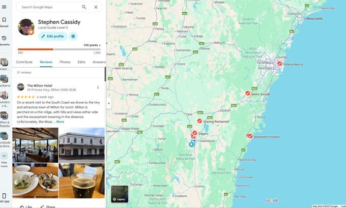 Finding myself on Google Maps‘On my blog, tableland, described as: Food and cooking land to table – the daily routine of living in the high country, on the edge of the vast Pacific, just up from Sydney, just down from Mount Kosciuszko, I publish articles about food produce and wine, travel and exceptional places I’ve stayed. The blog is the longer version. Some years back I started to post shorter versions of these articles as reviews to Google Maps. It was a fun thing to do, I enjoyed writing about places I had liked and it’s good to acknowledge the local businesses that help make our everyday life worthwhile. When I last checked I found I now have 31 reviews with 47 photos and, according to Google, at last count views of the photos totalled 442,923 – crazy’, Finding myself on Google Maps.Leaning towards Asia on a rainy night in the nation’s capital